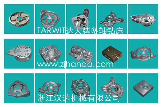 該產品可廣泛應用于機械行業(yè)多孔零部件的鉆孔及攻絲加工,如汽車、摩托車多孔零部件、發(fā)動機箱體、鋁鑄件殼體、制動鼓、剎車盤、轉向器、輪轂、差速殼、軸頭、半軸等,泵類、閥類、液壓元件、太陽能配件等等。比如以下工件: