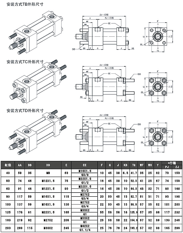 以下為YGD標準液壓缸TB\TC\TD四拉桿液壓缸具體參數(shù),客戶可按照以下圖表來選型。